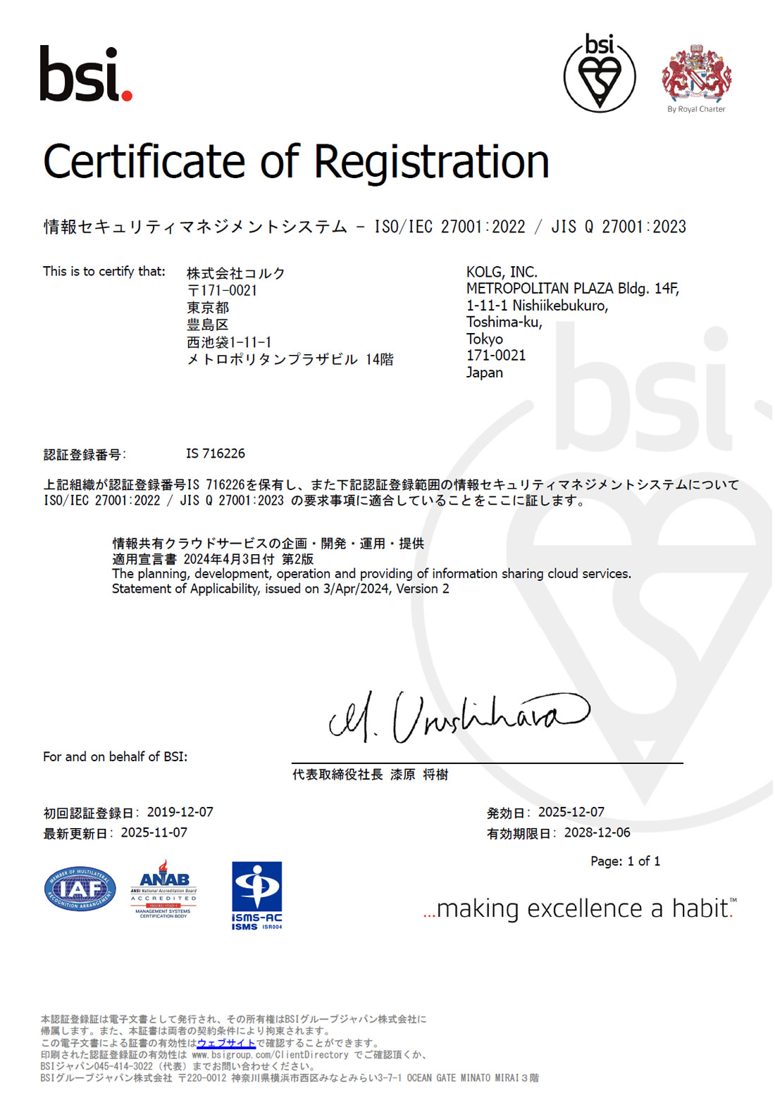 株式会社コルク(KOLG, INC.)は、情報セキュリティマネジメントの認証基準「JIS Q 27001(ISO/IEC27001)」を取得しています。ISO27001(ISMS)は、情報セキュリティ管理に対する国際水準の第三者適合性評価制度です。